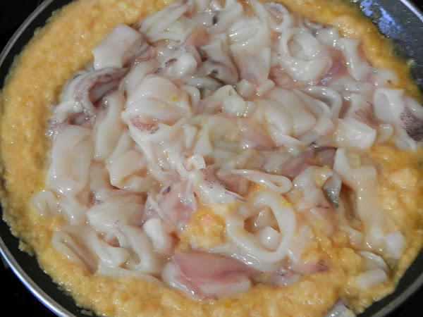 Limpiamos los calamares de tripas y quitamos la piel exterior, retiramos la cabeza y cortamos los tentáculos.