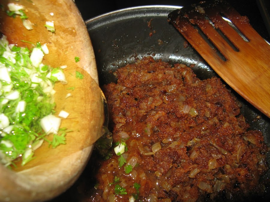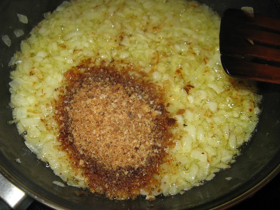 Ponemos un poco de aceite en una sartén y pochamos bien la cebolla con la guindilla troceada, cuando esté pochada añadimos 2 o 3 cucharadas de pan rallado (mejor casero)