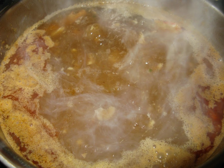 El caldo resultante lo colamos y lo ponemos a fuego lento