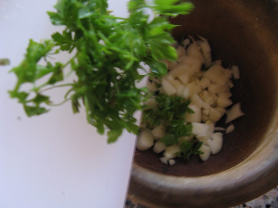 En un mortero ponemos los ajos y el perejil picado, una pizca de sal y pisamos bien, añadimos un chorro de vino blanco (reservamos)