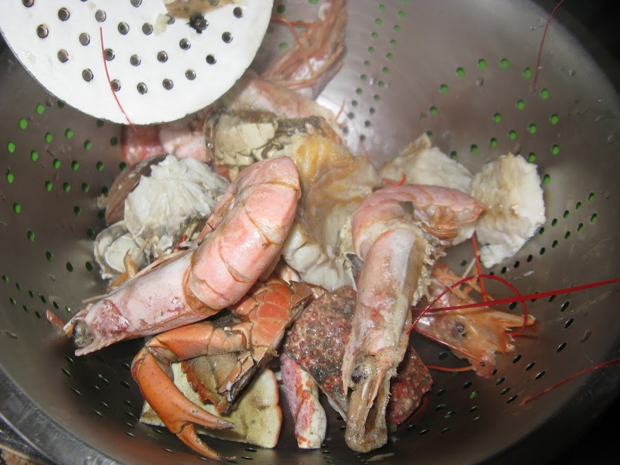 Mientras hierve el caldo con la mezcla pasada por el pasapuré se pelan y cortan los pescados y mariscos