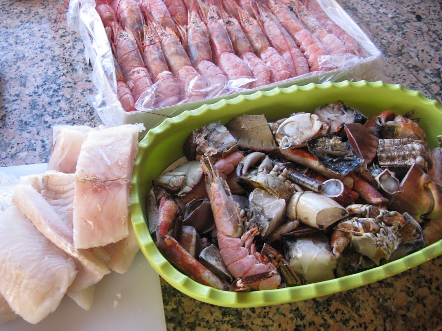 Mientras que hierve, pelamos y troceamos el pescado y marisco