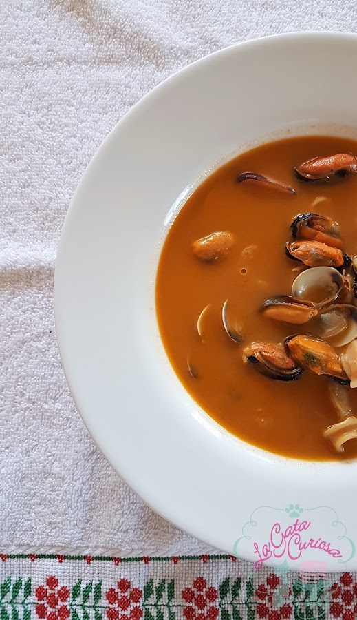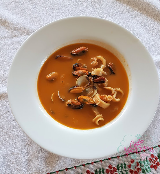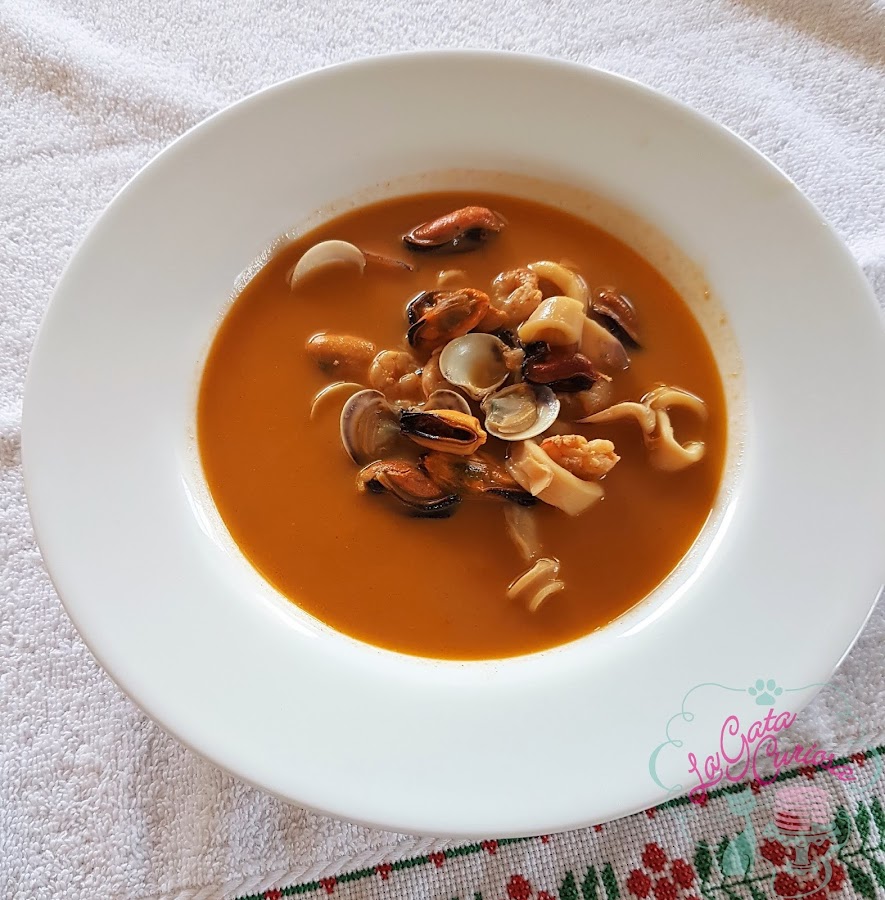 Esta sopa es una forma de aprovechar el fantástico fumet de gambas y galeras que había preparado para hacer un arroz con marisco, dicho arroz no pensaba subirlo pero al final y aunque sea una preparación que creo que ya está en el blog, lo subiré el próximo día. Además había comprado demasiado de todo para un arroz para cuatro personas por lo que la sopa fue una manera de aprovechar todo. Quedó muy, pero muy rica.