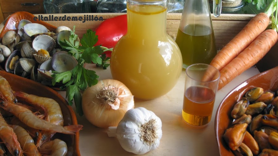 "Primero un sofrito con ajo, cebolla y pimiento finamente picado, luego...¡Lo que se te ocurra!" Gambas, Mejillones, Almejas, zanahorias picadas, caldo de pescado, un chorro de brandy, azafrán, perejil y sal.