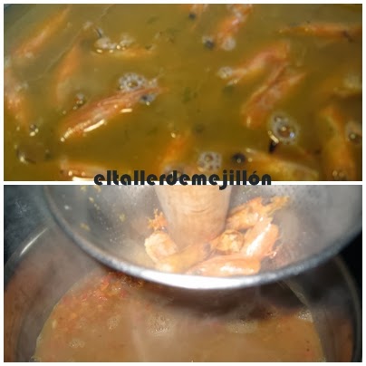 Tenemos la zanahoria, la cebolla, un diente de ajo y el pimiento rojo picado muy finito y lo ponemos en una olla con 30 ml de aceite dándole vueltas para que se dore. Añadimos el preparado de caldo y gambas que pasamos por un colador para que quede todo el sabor. Se completa con agua y dejamos cocer 20 minutos.