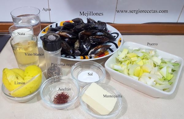 Cuando tengamos el puerro bien pochado pero sin que haya tomado color añadiremos el vino blanco y dejaremos que se reduzca a la mitad a fuego moderado para que vaya dejando su aroma impregnado, después añadiremos las 3/4 partes de los mejillones (dejándonos algunos para decorar) y pondremos el caldo de cocer los mejillones, el agua con el azafrán diluido y la nata (crema de leche) liquida, dejamos cocer todo el conjunto unos 10 minutos a fuego moderado, salpimentamos al gusto. Trituramos, colamos y llevamos de nuevo a ebullición rectificando de sabor.