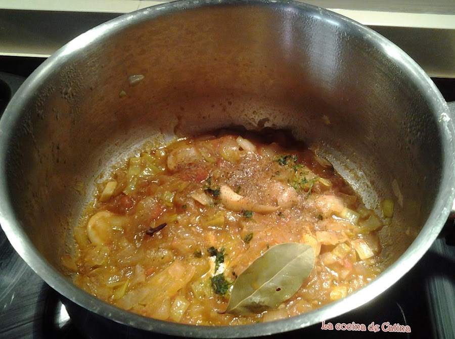 Añadir la harina y rehogar un minutos más. Agregar un litro de caldo de pescado y el jugo de la cocción de los mejillones que tenemos reservado. Condimentar con el clavo, la hoja de laurel, la pimienta y el azafrán y el perejil picadas.