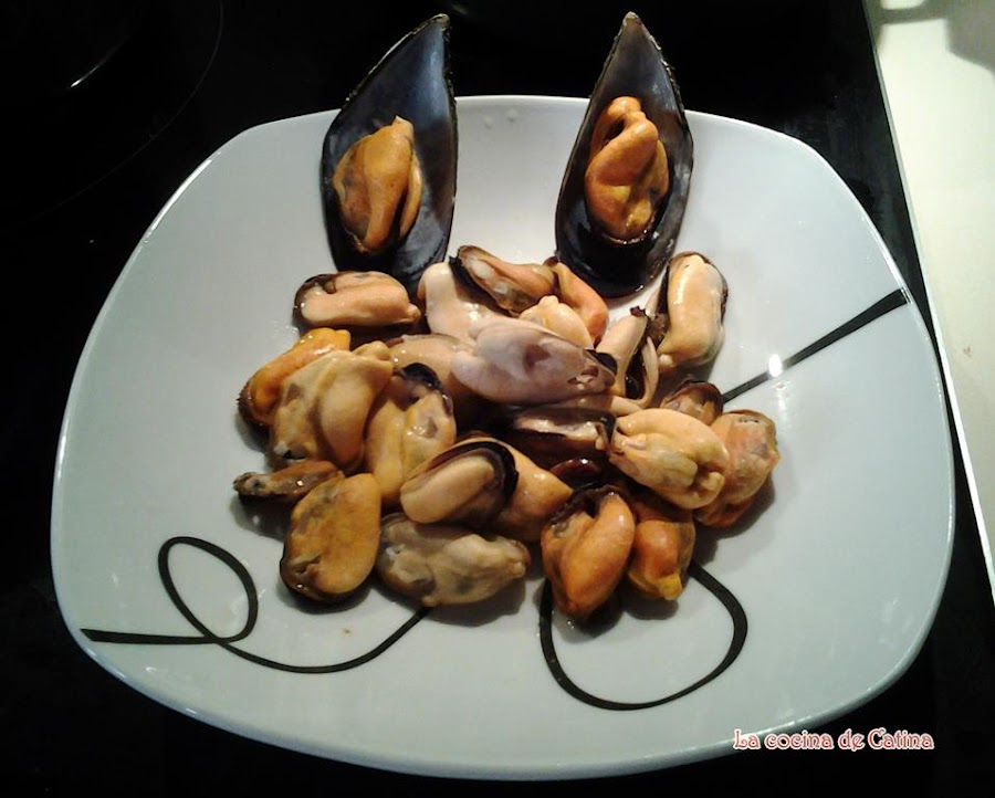 Limpiar bien los mejillones y abrirlos al vapor en una cazuela con un poco de agua (es suficiente con que cubra el fondo de la cazuela).