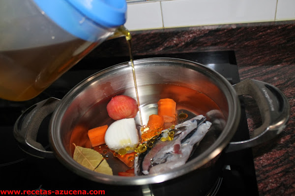 Para esta receta necesitamos un caldo de pescado, lo prepararemos con la cabeza y las verduras.