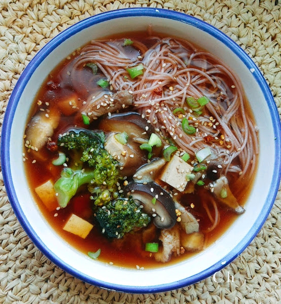 Sirve en un bol los fideos y encima el caldo de setas y miso. Decora con los aderezos.