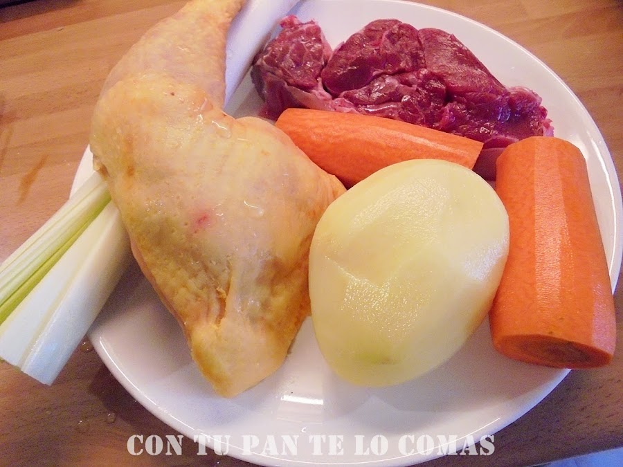 1. En primer lugar hacemos el caldo. Yo le quito la piel al pollo porque el rural tiene más grasa. Aún así después de hecho el caldo se debe desgrasar lo más que se pueda. Ponemos todos los ingredientes en una olla grande (o en la olla exprés), sal y agua hasta cubrir. Más o menos son tres litros, y es mejor no quedarse corto porque los galets van a consumir mucho al hervirse. En la olla exprés el caldo se hace en media hora aproximadamente y en olla normal por lo menos hora y media.