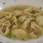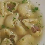 Colamos el caldo y cocemos en él las galets. Hay que tener mucho cuidado con el tiempo de cocción de esta pasta rellena, tarda bastante pero si nos despistamos se rompen y se sale el relleno de las conchas. Revisamos el punto de sazón y servimos los platos espolvoreados con perejil picado.
