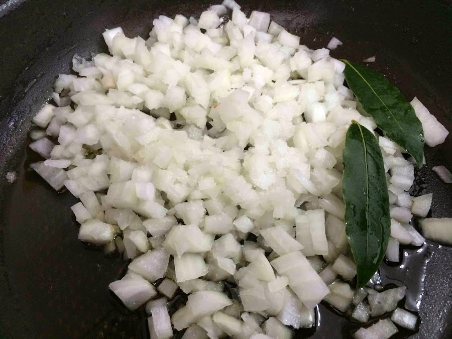 Picamos finamente la cebolla y la rehogamos junto con las hojas de laurel hasta que esté transparente. En ese momento le añadimos el tomate pelado y rallado.