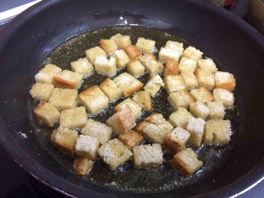 En el mismo aceite freímos la otra rebanada de pan cortada en dados. También la reservamos.