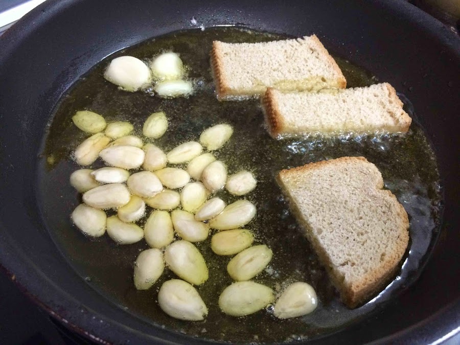 Empezamos friendo los dientes de ajo, las almendras y una rebanada de pan en un poco de aceite de oliva.