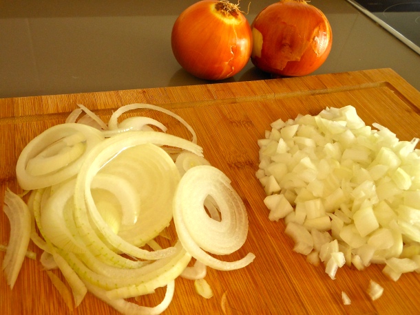 Seguidamente pela las cebollas, pica una en dados y la otra en aros.