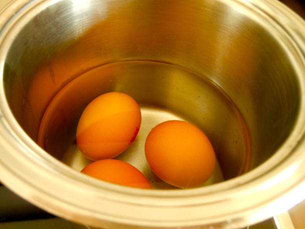 Vamos a comenzar esta receta elaborado unos huevos duros, para ello introduce los tres huevos en un cazo, cúbrelos de agua y llévalos a ebullición.
