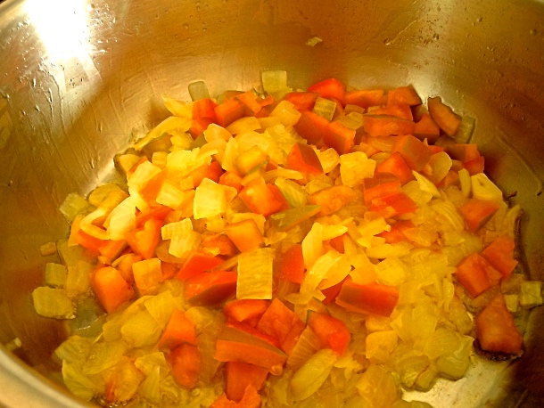 Cuando la cebolla esté blandita agrega el tomate, remueve con tu cuchara de madera y continúa la cocción cinco minutos más.