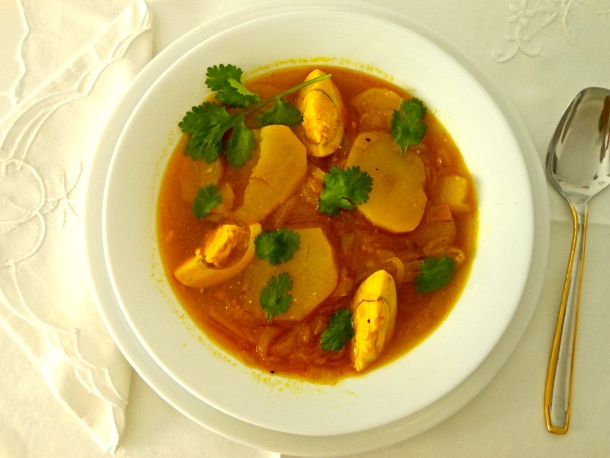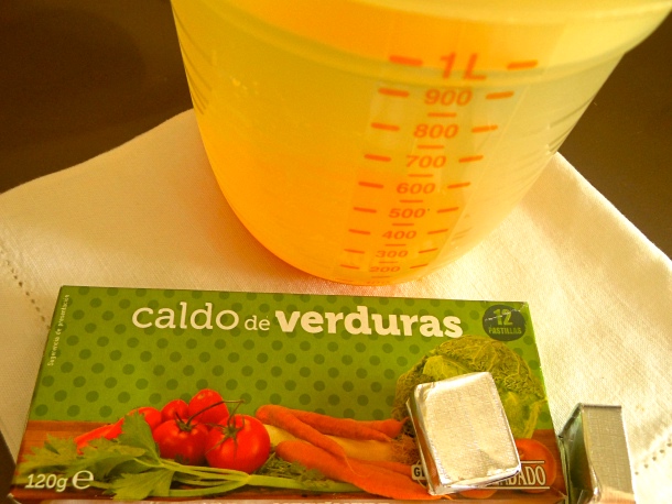 A continuación vierte el litro de agua, las dos pastillas de caldo de verduras y la cucharadita y media de curry en polvo.
