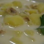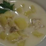 Cuando las patatas estén tiernas, añadimos el pescado troceado y salpimentado. Tres minutos después, separamos la cazuela del fuego, rectificamos de sal si fuera necesario e incorporamos la mayonesa poco a poco removiendo continuamente el caldo de la cazuela hasta que se diluya por completo.