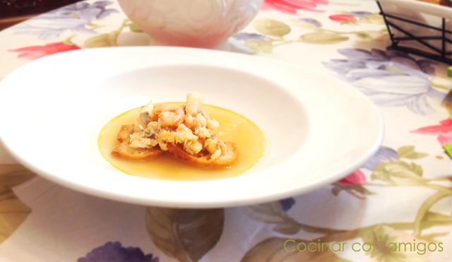 Serviremos dos rebanadas de pan frito por plato, sobre este añadiremos el sofrito de pescado (gambas, chirlas, rape y sepia), por último incorporamos el caldo bien caliente por encima.
