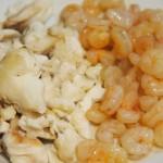 Agregamos después a la cazuela el pescado desmenuzado y unas gambitas peladas (que podemos pasar por la sartén o poner en crudo), rectificamos la sazón si es necesario y dejamos cocer unos 5 minutos más.