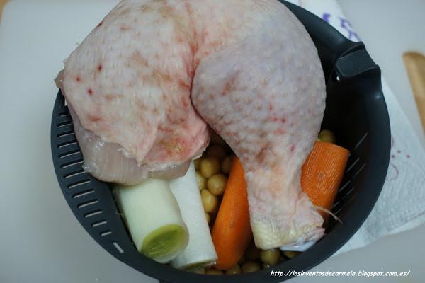 3) Introducir el cestillo dentro del vaso y colocar en él el pollo,las verduras y los garbanzos.Verter el agua y la sal.Programar 50 minutos, 100º, velocidad 1.