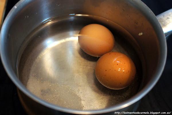 Para hervir los huevos, poner en un cazo y cubrirlos de agua, añadir una cucharadita de sal y un chorrito de vinagre, llevar a ebullición y contar 7 minutos desde el momento que empiece a hervir. Escurrir y enfriar bajo el chorro de agua fría. Pelar y reservar.