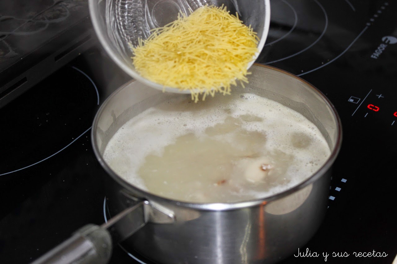 Ponemos el caldo del cocido en un cazo y añadimos la carne y los fideos, y dejamos cocer hasta que estén al dente.