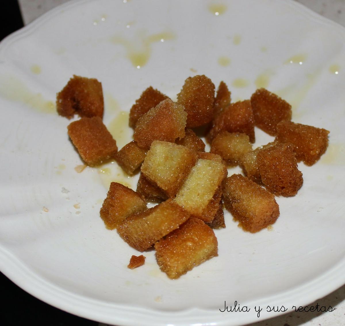 Troceamos el pan en cuadraditos y los freímos y reservamos.