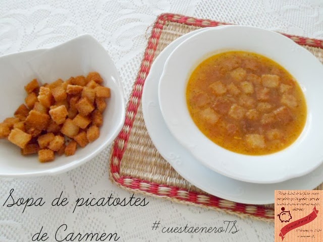 Una vez servida la sopa en el plato, se le añaden los picatostes de pan (no antes, porque nos interesa que estén crujientes)