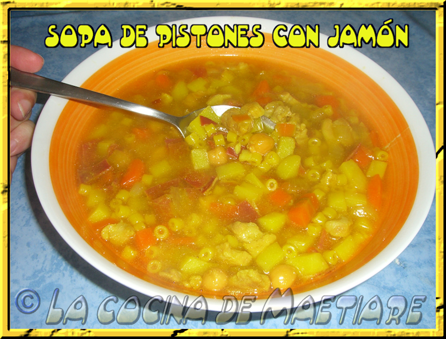 Poner el agua a calentar en una cacerola. Añadir zanahoria, patata y cebolla cortada en cubitos pequeños. Añadir los tacos de jamón y el filetito de lomo troceado . Añadir el ajo y los garbanzos. Añadir las pastillas de caldo y la curcuma. Cuando el agua comience a hervir añadir la pasta y cocinar a fuego medio bajo , tapado , removiendo de vez en cuando. Cuando la pasta esté cocida , la sopa estará lista ( la patata y zanahoria también lo estarán al haberlas cortado en pequeños cubitos).
