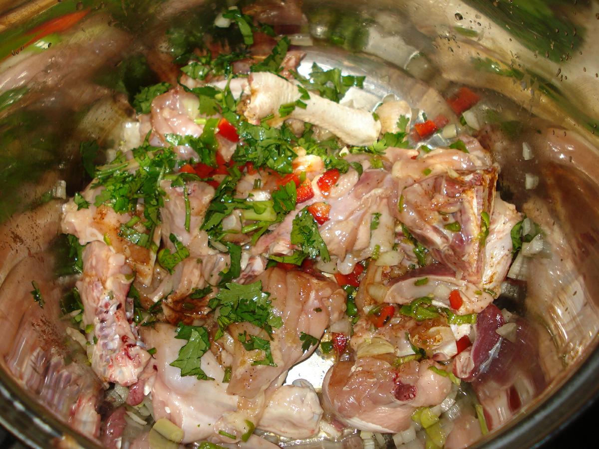 Cortar cebolla, cebollín, ajíes dulces y ajo. Añadir al pollo y sellar o dejarlo dorar por 2 min aprox en una olla profunda con aceite.