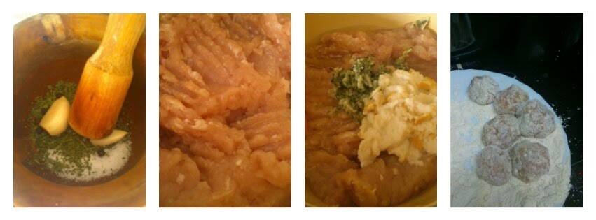 1.Picamos en un mortero la pimienta negra , los ajos, el perejil , y sal , lo machacamos todo hasta obtener una pasta ,mientras mojamos las migas de pan en un poco de leche.