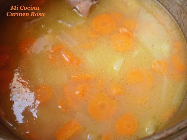 Aprovechando la carcasa, las alas, el cuello y los contra muslos (Cuando compro un pollo, a veces le pido al carnicero que filetee las pechugas (para hacer otras recetas), los muslos los trocee sin piel para hacer paella o la sopa de pollo con almendras, o bien enteros para el horno?.que me deje la carcasa y las partes menos nobles para un caldo, como en ésta ocasión.