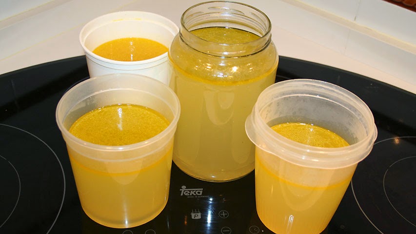 Cuela el caldo. Para esta receta utilizaremos parte y lo que sobre lo puedes congelar en diferentes botes para usarlos en otra ocasión.