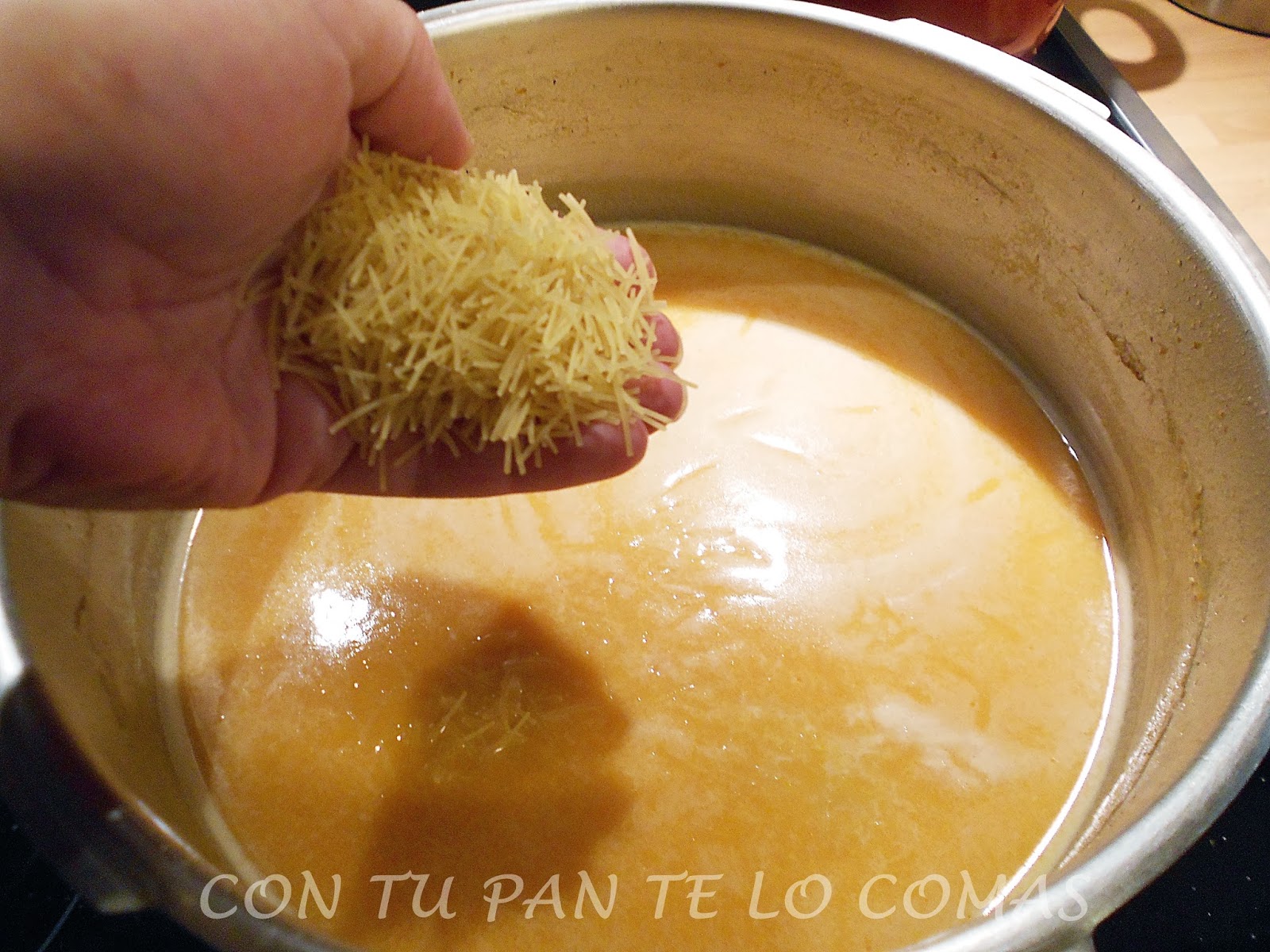 Volvemos a poner la olla al fuego y ponemos un puñadito de fideos por persona. Pueden ser fideos o la pasta de sopa que más os guste, el tiempo dependerá de la que utilicéis. Yo pongo fideos cabello de ángel que en dos minutos están hechos y no consumen tanto caldo.