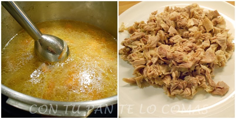 Cuando esté hecho sacamos el pollo y lo dejamos que se enfrie un poco para quitarle los huesos y dejarlo troceado para el final. Tápalo para que no se seque.