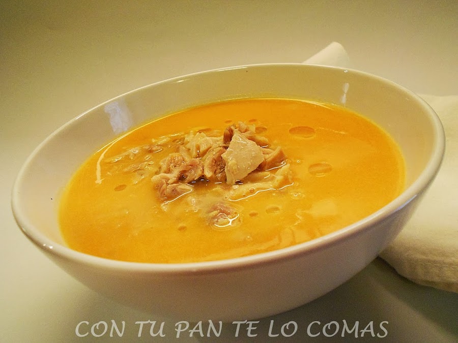Ya lo tenemos todo, servimos la sopa en los platos y una buena cantidad de pollo en trocitos. Para mí tiene un color de lo más apetitoso. Se le puede añadir una cucharadita de aceite de oliva en crudo, que en realidad es como mejor se aprovechan los beneficios del aceite de oliva.