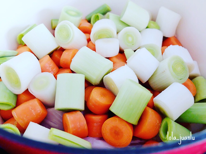 Lavamos y cortamos las zanahorias en trozos grandes y desechando las puntas. Lavamos, pelamos y cortamos los puerros en rodajas grandes.