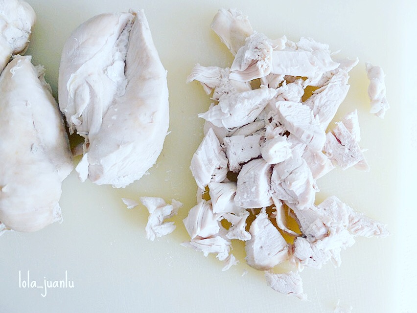 Sacamos el pollo del caldo y troceamos. Colamos el caldo y lo echamos en una olla limpia. Volvemos a calentar, esta vez sin hervir.