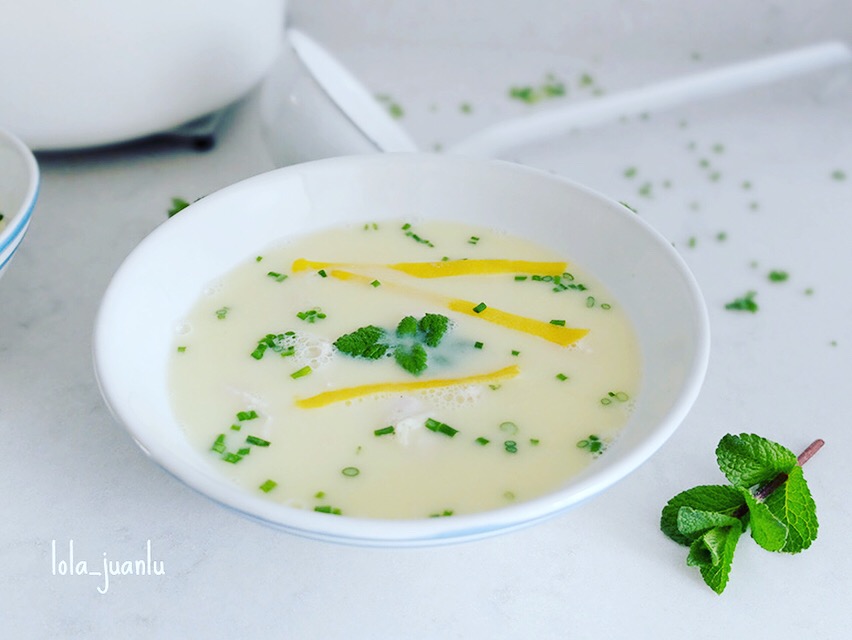 Servimos en boles y decoramos con ralladura de limón, cebollino picado muy fino y hojas de melisa.