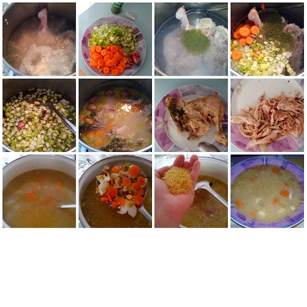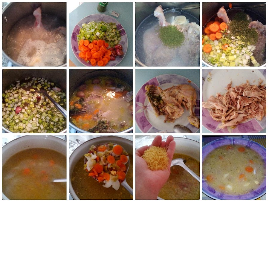 El pollo lo deshuesamos y desmenuzamos. Se puede añadir a la sopa o apartarlo para hacer croquetas. Por ultimo, volvemos a poner e el fuego la sopa y añadimos los fideos, 2 minutos y listo para comer!!!