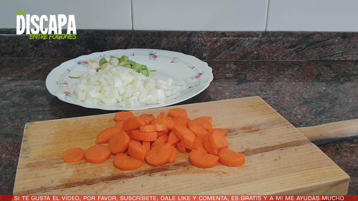 2Mientras se cuecen los huevos, vamos a cortar las verduras. Cortamos un puerro el trozos, no hace falta que sean trozos muy pequeños porque luego lo vamos a triturar. Lo reservamos en un plato. Después trocemos una cebolla o cebolleta y lo reservamos junto con el puerro. Ahora pelamos y troceamos una zanahoria y una vez cortada la reservamos junto con el resto de verduras.