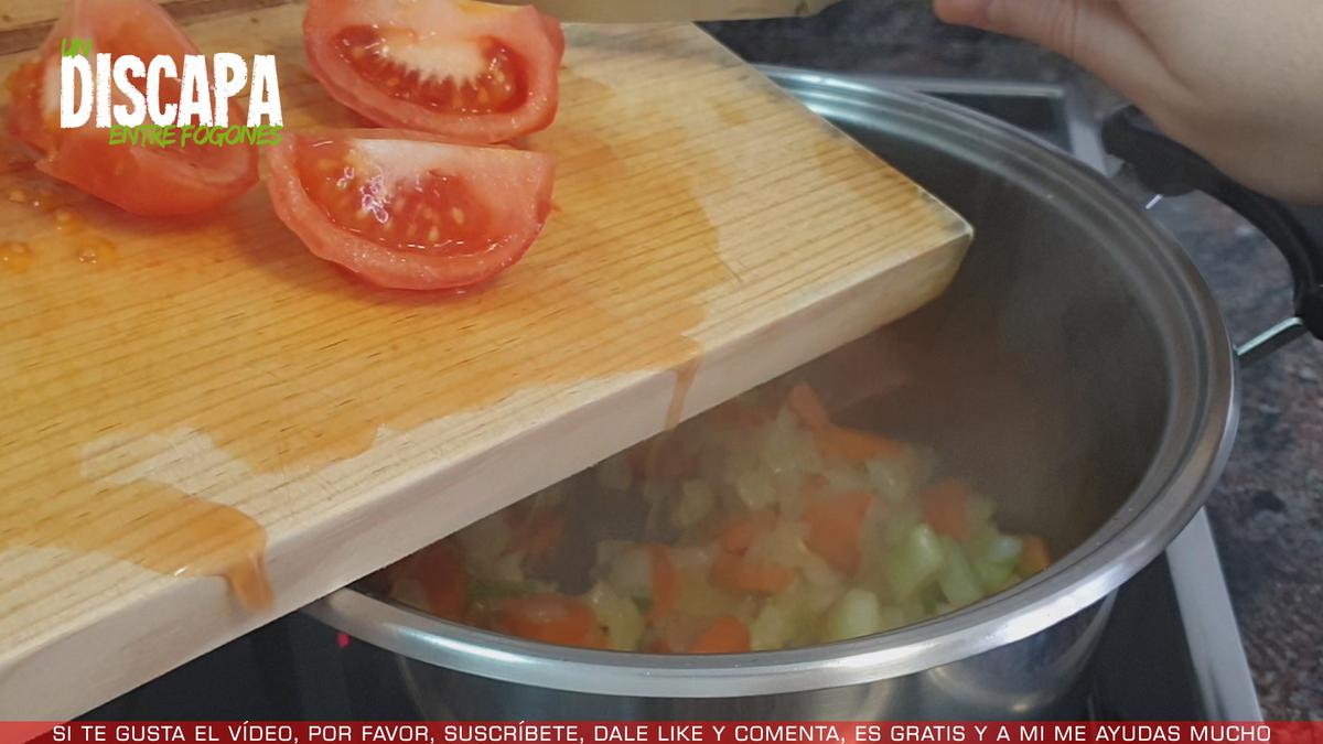 4Mientras se pochan las verduras, pelamos un tomate y lo troceamos. Y cuando las verduras ya están medio pochadas añadimos el tomate troceado.
