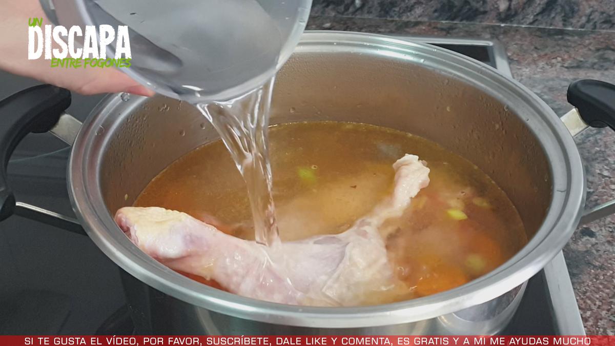 6Después añadimos los muslos de pollo y cubrimos con agua. Añadimos sal y le ponemos la tapa a la cazuela, dejamos que se cueza una hora o una hora y media por lo menos.