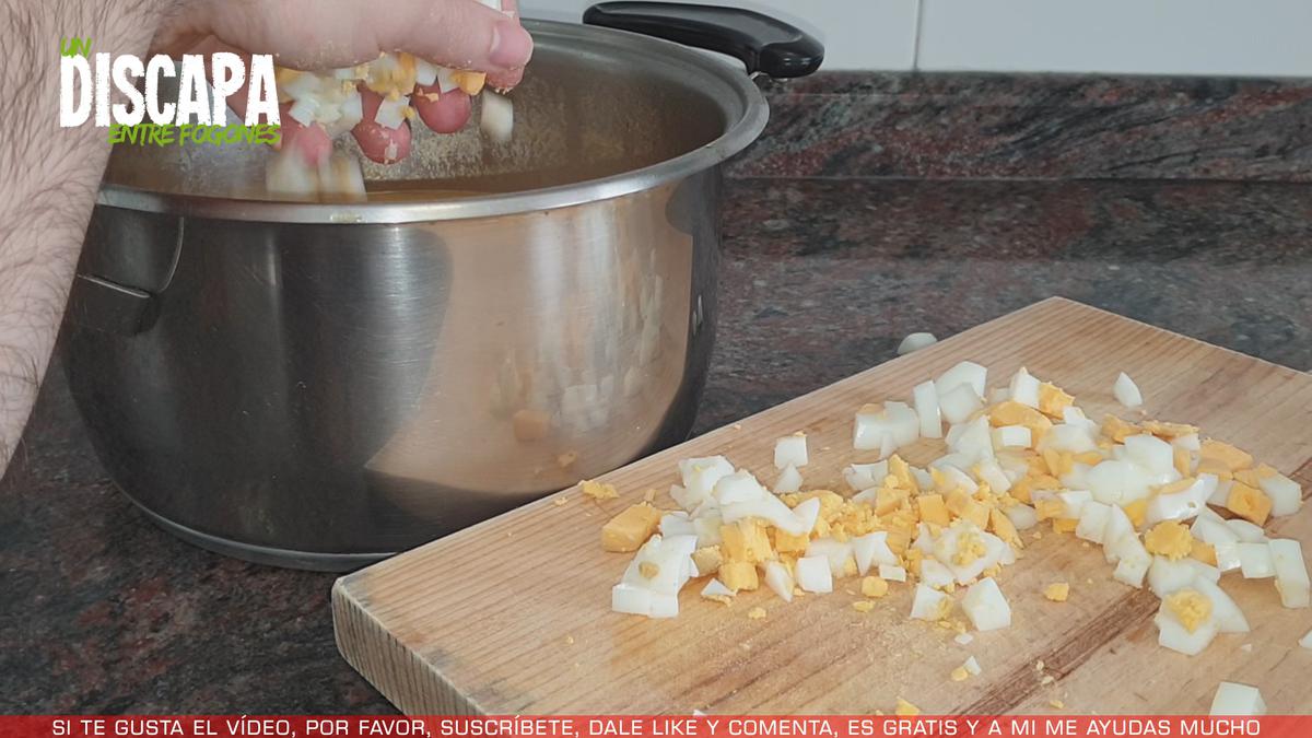 8Cuando ya esta bien triturado, pelamos los 2 huevos que habiamos cocido al principio, los picamos y los añadimos a la cazuela.