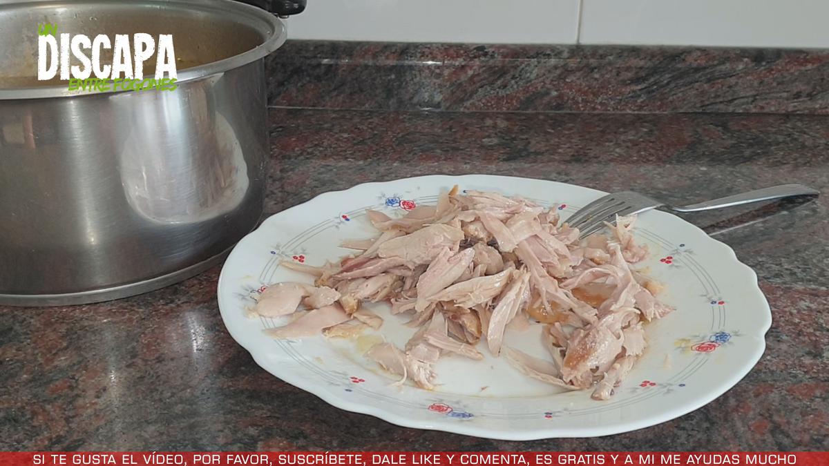 7Pasado ese tiempo, sacamos los muslos de pollo de la cazuela y trituramos.
