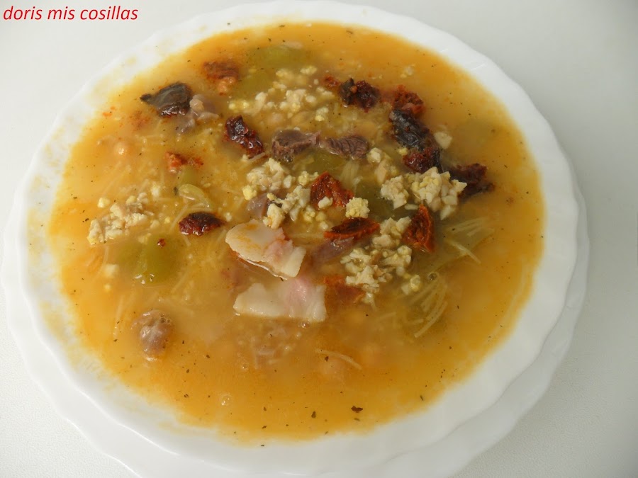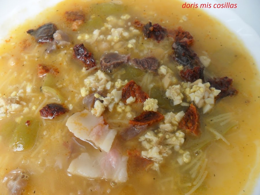 Agregamos al caldo unos fideos finos y una vez cocidos apartamos en platos con la verdura a trocitos, chacina, huevo cocido y espolvoreamos con la hierba buena seca.