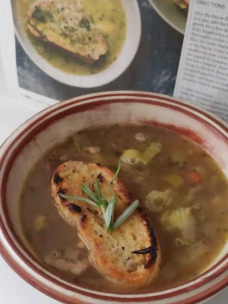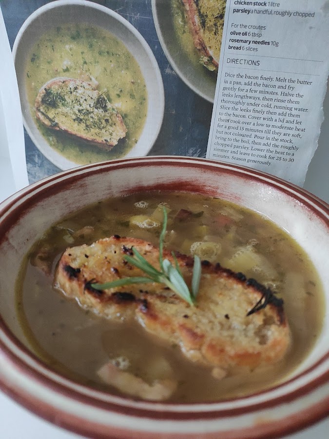 Cortamos el bacón en trocitos. Ponemos la mantequilla en una sartén y añadimos el bacón, freímos a fuego suave unos minutos. Cortamos los puerros los lavamos bajo el grifo de agua fría. Los cortamos en rodajitas y los añadimos a la sartén junto con el bacón. Tapamos y dejamos que se cocine a fuego lento unos 15 minutos hasta que estén blandos pero sin dorarse. Añadimos el caldo de pollo y lo llevamos a ebullición. Ahora echamos el perejil picado. Bajamos el calor y dejamos cocinando unos 20 o 25 minutos. Salpimentamos al gusto.